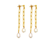 - Chain earrings with drop pearls on front studs and earring jackets.