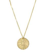 - Coin pendant with Sunburst design suspended on bar chain in Small or Large.