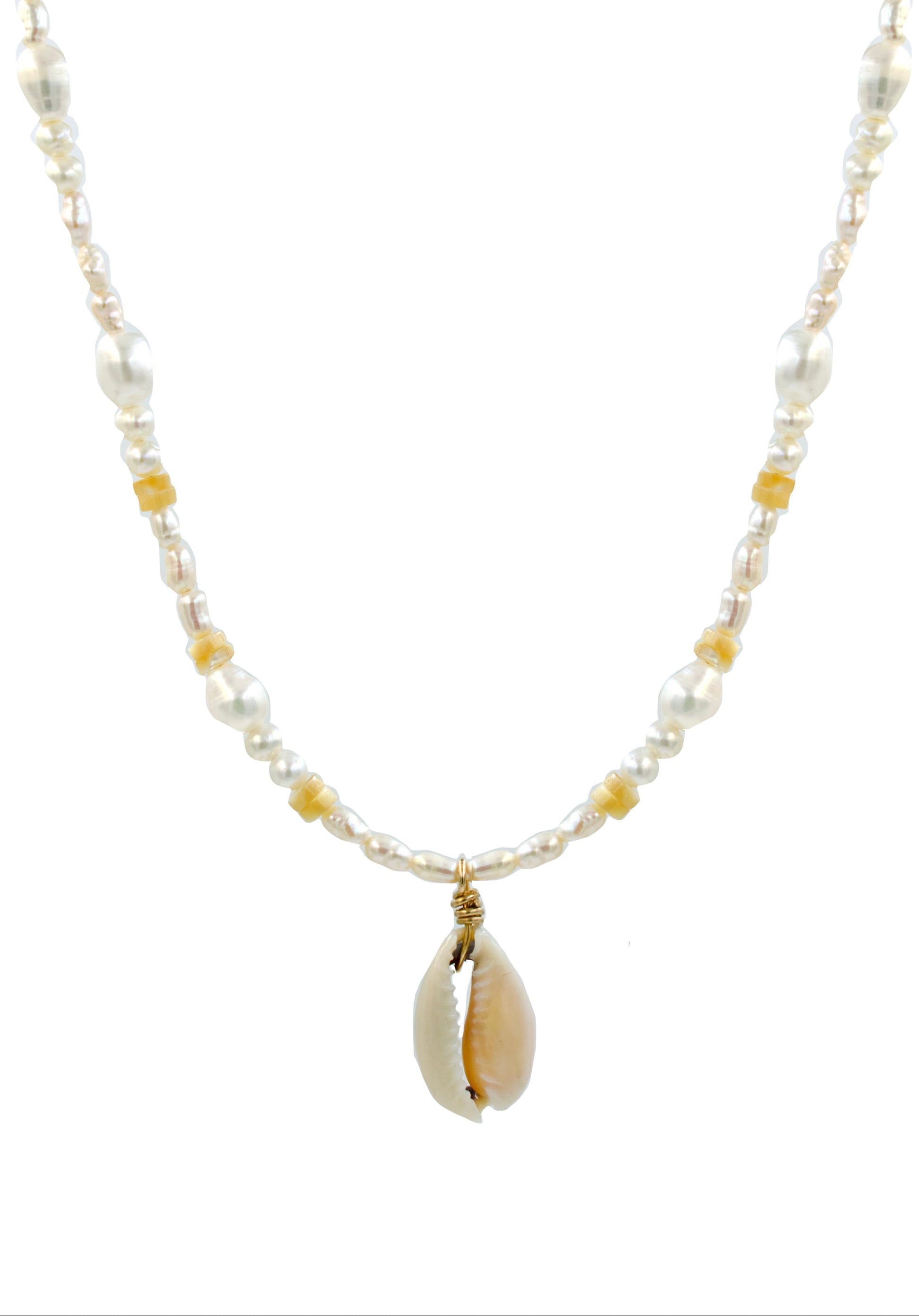 • Beaded necklace with cowrie shell pendant.